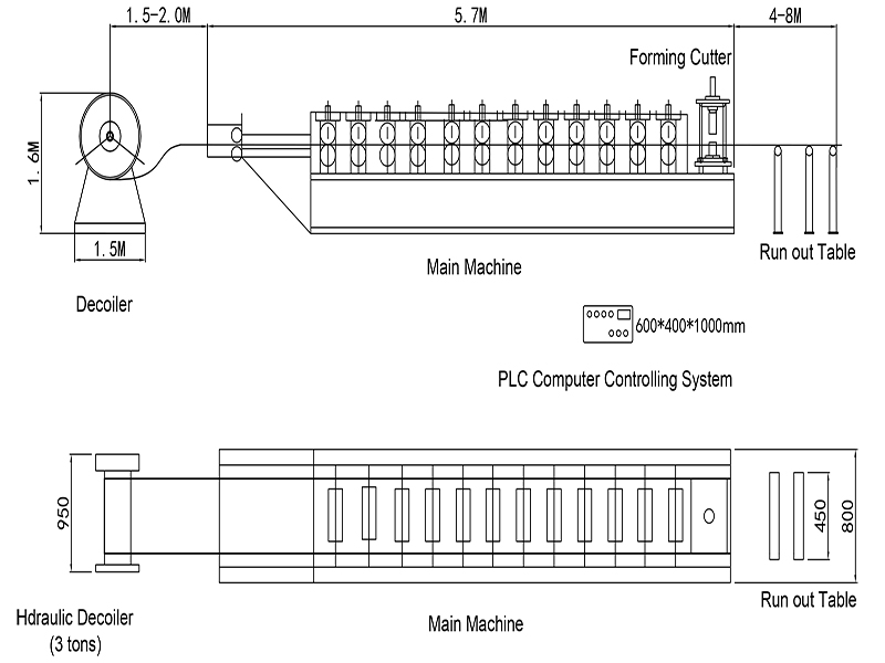 Decoiler → Feeding Guide Device→ Roll Forming Mill→ Hydraulic Post Cutter→ Exit Rack (3M)→Hydraulic System→PLC Control System